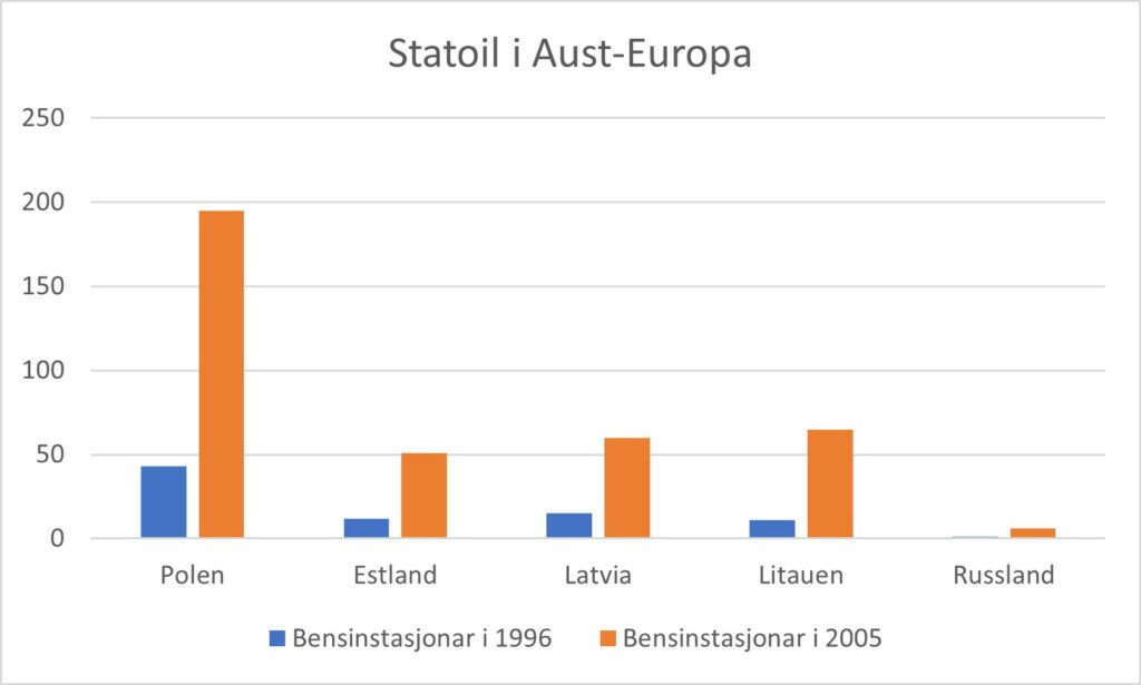 I løpet av 1990-åra og det fyrste tiåret etter 2000 blei det etablert stadig nye stasjonar i Baltikum, Polen og Russland (sjå graf[REMOVE]Fotnote: Statoil, årsrapport, 1996, s. 29. Og Statoil, årsrapport, 2005, s. 27.), men allereie i 1997 blei det tyske dotterselskapet selt. Dei 50 tyske bensinstasjonane blei selte fordi Statoil ikkje tente nok pengar på dei og fordi det var vanskeleg å få Statoil Tyskland til å vekse. Statoil ville heller bruke ressursane i Polen og Baltikum.[REMOVE]Fotnote: Statoil, årsrapport, 1997, s. 11 og 26. Og Styremøte i Statoil, 17. mars 1997.