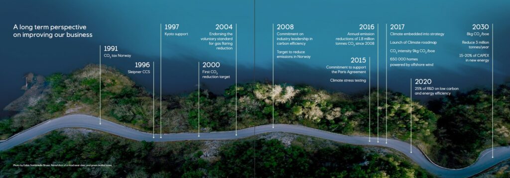 Statoil utga sin første Bærekraftrapport i 2001.[REMOVE]Fotnote: https://cdn.sanity.io/files/h61q9gi9/global/b5f2c765f75d9d95c691cd961f5a7a5707e695e0.pdf?sustainability-report-2001-equinor.pdf I 2007 startet arbeidet med selskapets første klimaplan. Den kom som en reaksjon på klimameldingen regjeringen la fram samme år. St. meld. 34 (2006–2007), Norsk klimapolitikk la føringer for hvilket ambisjonsnivå den norske stat burde legge seg på når det gjaldt reduksjon i utslipp av klimagasser.[REMOVE]Fotnote: St. meld. 34 (2006–2007), Norsk klimapolitikk. https://www.regjeringen.no/contentassets/c215be6cd2314c7b9b64755d629ae5ff/no/pdfs/stm200620070034000dddpdfs.pdf Petroleumsindustrien kunne etter regjeringens syn bidra på to måter: ved elektrifisering av sokkelen og forskning på havvindkraft.[REMOVE]Fotnote: St. meld. 34 (2006–2007), Norsk klimapolitikk: 55 og 67.