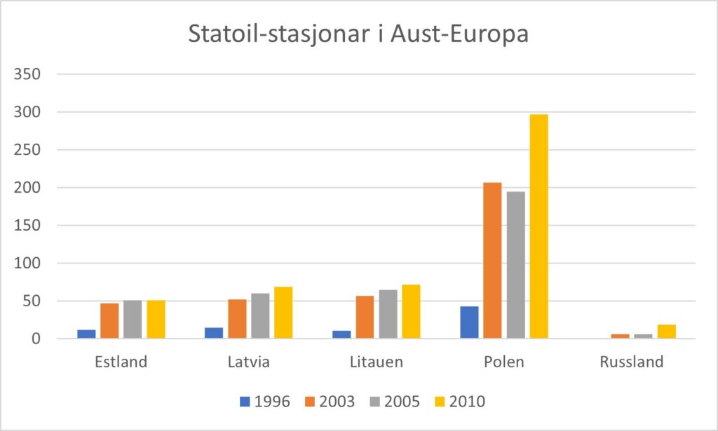 Ein annan grunn til Statoil sin suksess i området er at selskapet etablerte seg så tidleg i Baltikum.[REMOVE]Fotnote: Statoil, årsrapport, 2003, s. 6. I løpet av 1994 etablerte Statoil 23 nye stasjonar i Austersjøområdet.[REMOVE]Fotnote: Statoil, årsrapport, 1994, s. 32. Eitt år etterpå var 55 nye stasjonar etablert i Tyskland[REMOVE]Fotnote: Bensinstasjonane i Tyskland blei selt i 1997. Les meir i «Frå Russland til Irland – bensinstasjonar i aust og vest»., Polen og Baltikum.[REMOVE]Fotnote: Statoil, årsrapport, 1995, s. 26. Og i 1997 hadde Statoil 65 stasjonar i drift i Polen og omkring 60 stasjonar i Baltikum.