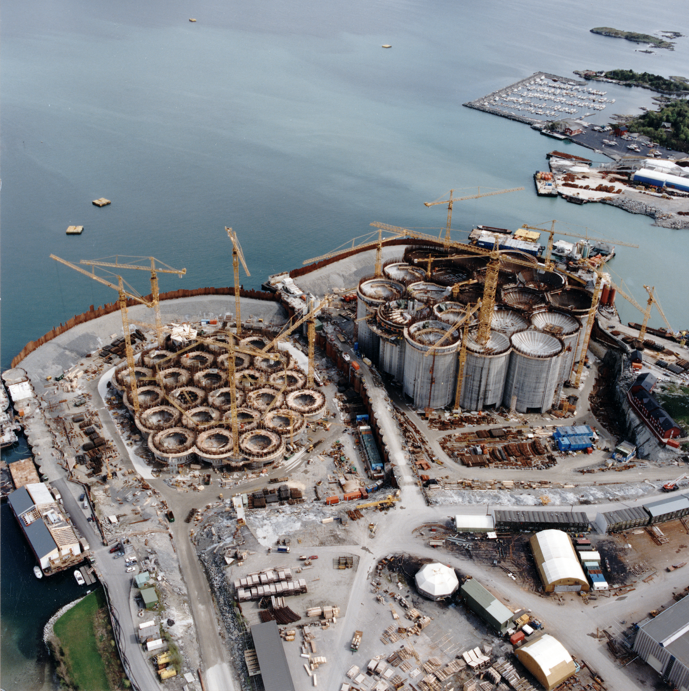 Bunnen av betongkonstruksjonene ble støpt i tørrdokk. Deretter fortsatte arbeidet på egnet fjorddyp til et fullstendig understell i betong stod ferdig. Da plattformdekket skulle plasseres oppå var understellet senket så dypt at bare den øverste delen var over havoverflaten. Så ble hele plattformen hevet og deretter slept ut til feltet. Den høye vekten på konstruksjonen gjorde at den stod støtt på havbunnen uten ytterligere fundamentering. En stålplattform ville ha krevd peling i havbunnen. REMOVE]Fotnote: For en grundig innføring i byggingen av en Condeep-plattform, se denne artikkelen om Draugen: Sandberg, Finn Harald 2018. Bygging av betongdelen. https://draugen.industriminne.no/nb/2018/05/14/bygging-av-betongdelen-til-plattformen/ (Besøkt 25.04.2022.)