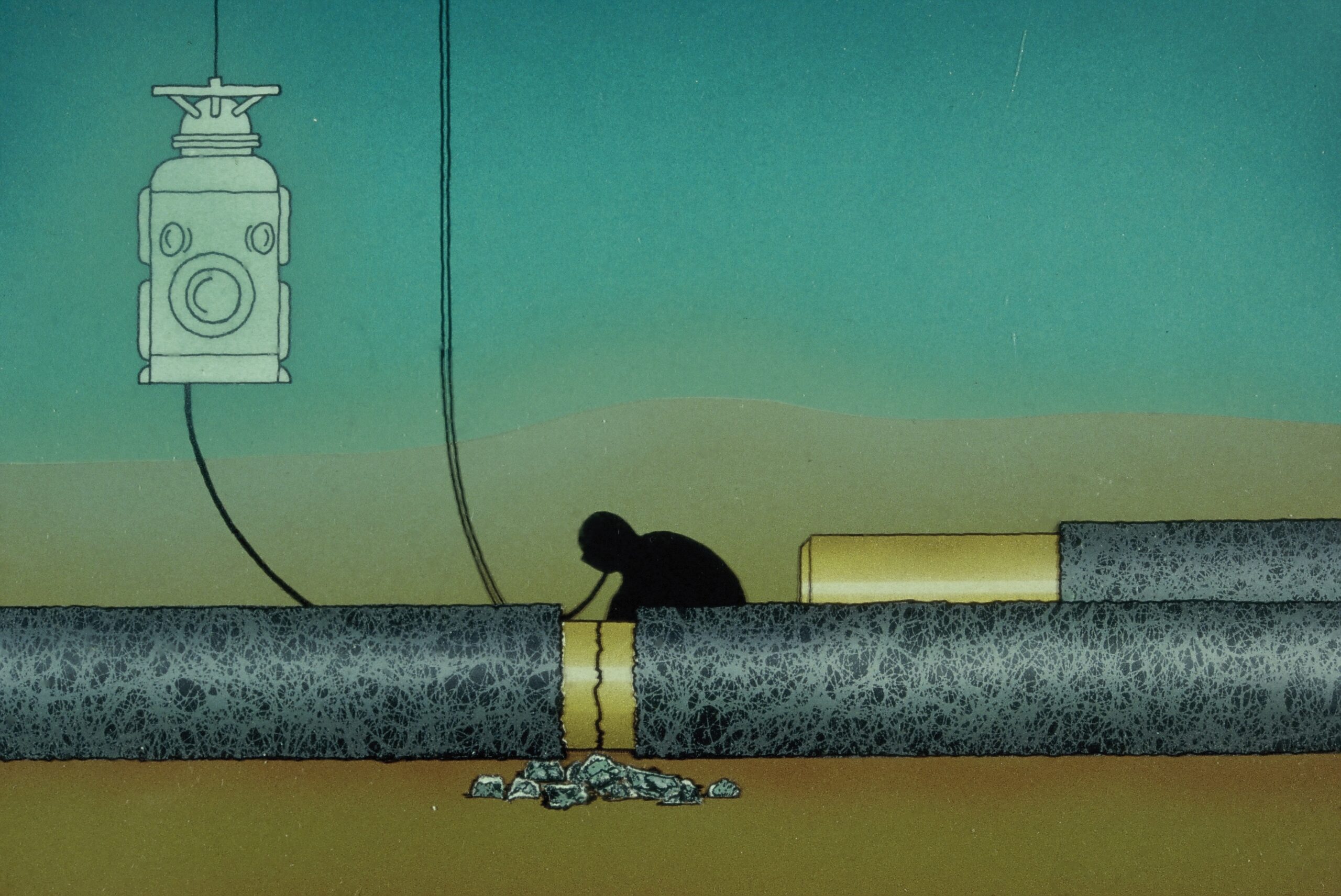 Arbeid med rør under vann. Illustrasjon: Equinor/Norsk Oljemuseum