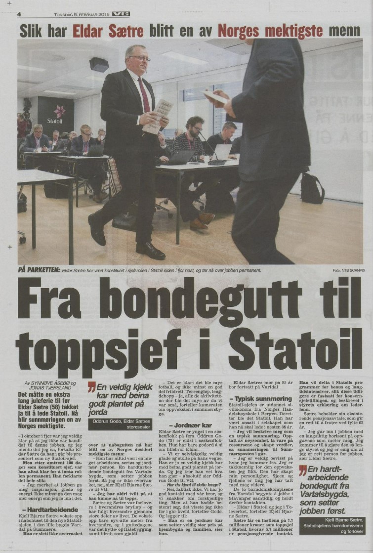 I februar 2015 ble det imidlertid kjent at Sætre hadde fått jobben.[REMOVE]Fotnote: Eldar Sætre ny konsernsjef i Statoil. (Pressemelding 04.02.2015): https://www.equinor.com/no/news/archive/2015/02/04/04FebEldarSaetreCEO (Besøkt 04.01.2022.) Omstendighetene var uvanlige: Sætre var den første konsernsjefen som var blitt rekruttert fra egne rekker. I tillegg overtok han etter den første konsernsjefen som ikke ble presset ut av stillingen av kostnadsoverskridelser eller en korrupsjonssak.