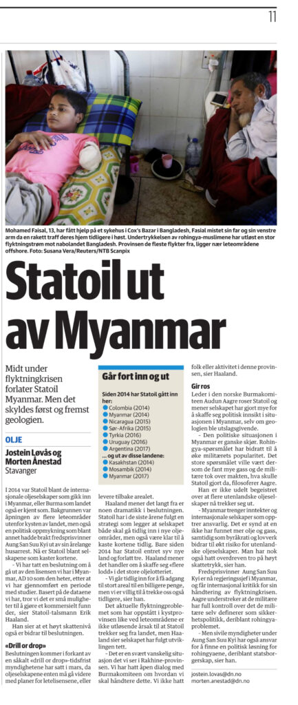 The refugee problem in Rakhine state, close to the exploration site, did not help to trigger Statoil’s withdrawal decision. But the company’s spokesperson said it had followed developments closely and had neither people nor activity there.[REMOVE]Fotnote: DN, 3 December 2017, “Midt under flyktningkrisen forlater Statoil Myanmar. Men det skyldes først og fremst geologien”.