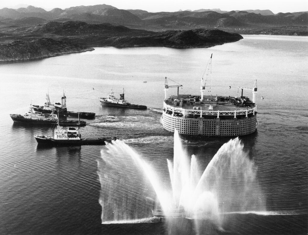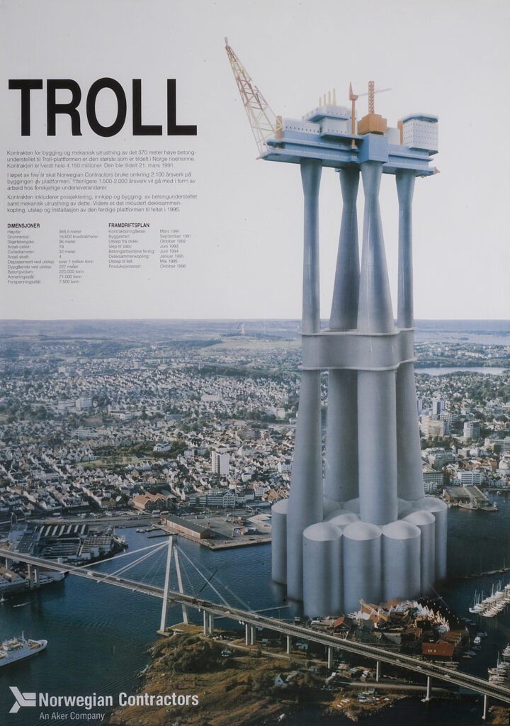 Following the unique Ekofisk concrete oil storage tank, the Norwegian Contractors consortium built 16 of its Condeep gravity base structures (GBSs) in concrete to support offshore platforms. The tallest was Troll A, which ranks as the world highest moveable construction. Stavanger’s Rosenberg Mek Verksted yard, which had previously built oil tankers and gas carriers, assembled the steel topsides for a number of these platforms. Between them, these two companies created thousands of jobs – including many for guest workers.