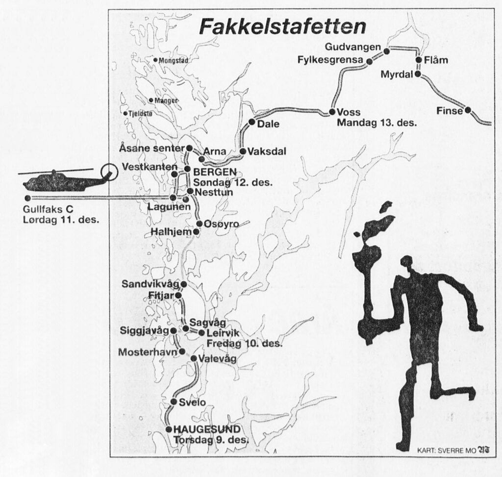 After the ceremony, a show was staged in the platform’s cinema with musician Tor Endresen and trumpet-player Ole Edvard Antonsen as the best-known performers. And during this event and throughout the night until it returned to land the following day, the lantern with the Olympic flame was kept in the office of offshore installation manager Rune Botnevik. It then passed to Bergen, Voss and beyond.[REMOVE]Fotnote: Bergens Arbeiderblad, 11 December 1993, “OL-fakkelen til Gullfaks C”. That was not the only time the flame became airborne. A plane carried it on 31 December 1993 to Svalbard for a big New Year celebration.