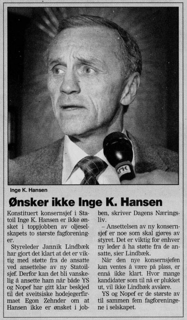 Hansen’s chances of becoming the permanent CEO were weakened by critical comments from union representatives in the company, which related to what was seen as insufficient openness about Statoil’s involvement in Iran.[REMOVE]Fotnote: Ibid: 106-108.