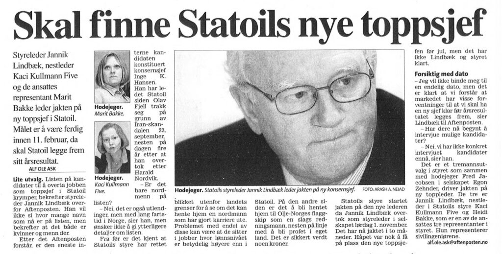 Hansen followed up this tradition in January 2004. At the initiative of chair Jannik Lindbæk, he raised the issue with Hydro CEO Eivind Reiten.[REMOVE]Fotnote: Bøe, Arnt Even, “Defensiv Lindbæk tar ansvar”, Stavanger Aftenblad, 4 March 2004: 7.