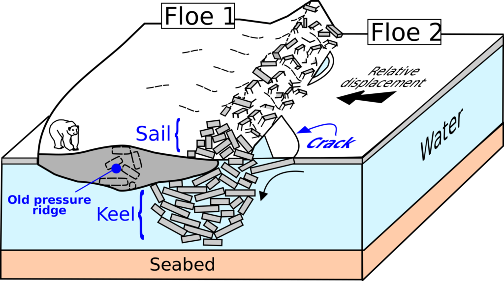 The Norwegian term “skrugard” denotes a pressure ridge created when ice floes are squeezed together and break up, while blocks of ice between them freeze wholly or partly and become compacted.