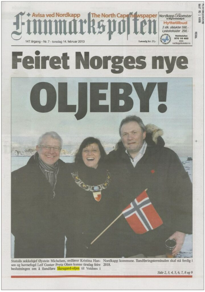 A resolution came on 12 February that year, with a presentation at Veidnes in Nordkapp local authority. Oil from Johan Castberg was to be piped 280 kilometres to a storage facility at Veidnes for loading via a quay to tankers, with 50-100 calls per year. Statoil’s own figures indicated 50 jobs directly associated with the landfall, in addition to the construction phase and spin-offs. Some people were even concerned about the “massive” growth, but nevertheless took a positive view. “This will challenge the local council in terms of area planning and development, but we accept that challenge with pleasure,” said Labour mayor Kristina Hansen.[REMOVE]Fotnote: Nordlys, 12 February 2013.