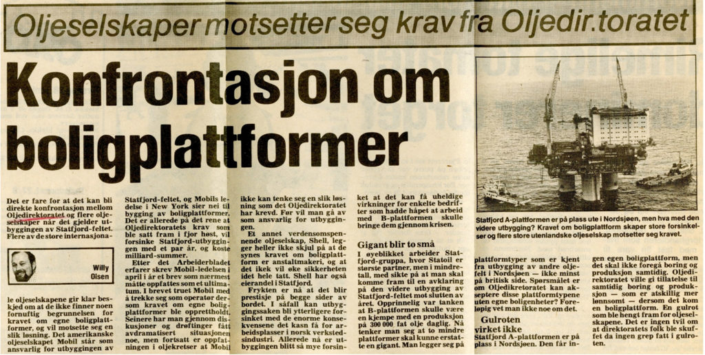 A telex from New York made it clear that it looked as if concrete platforms of Statfjord A’s size had had their day on that field, and Mobil was willing to resign as operator for the B platform if a two-platform solution was adopted. That took Statoil and the Norwegian government by surprise.[REMOVE]Fotnote: Norsk Oljerevy, no 5, 1977, op.cit.”