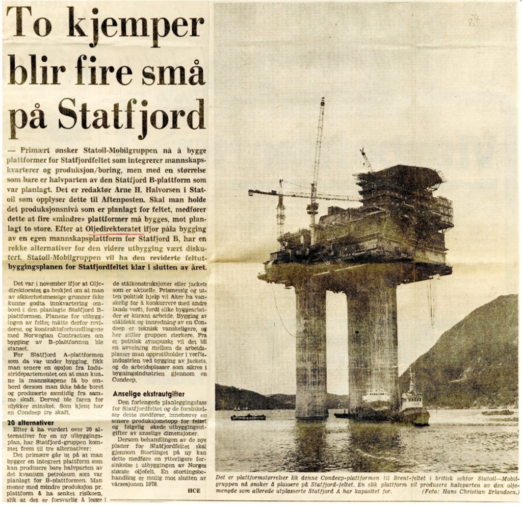 The recently formed Norwegian Petroleum Consultants joint venture had already signed a contract for project management and engineering of the B structure. While fabrication of the deck and outfitting of the concrete shafts remained to be finalised, an option agreement had been reached with the Aker group.