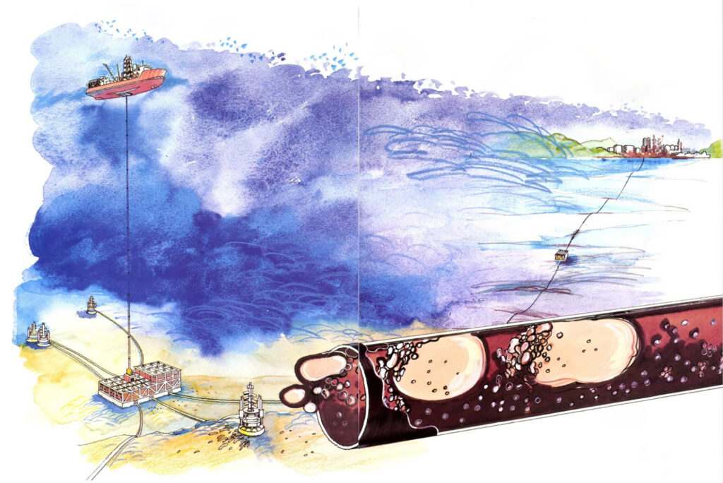 To avoid this, the engineers designed very robust devices on the platform known as slug catchers. These were dimensioned to withstand the force of the liquid “punches”. Another risk was the formation of hydrates, solids which could be damaging for the pipeline and difficult to dislodge. All in all, the wellstream flow can vary. At one point, it can be layered, with water and oil at the bottom and gas on top, and moving smoothly. Elsewhere it can look like a chaotic mess of oil, gas pockets, water droplets and long slugs.