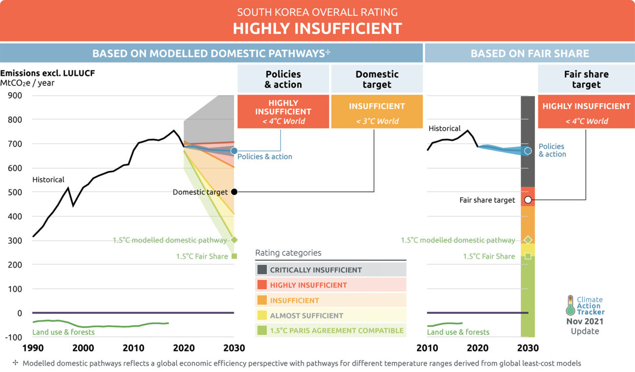 South Korea has accepted a legal obligation to become climate neutral by 2050. That represents a major commitment, given that it has the world’s ninth-highest greenhouse gas (GHG) emissions. The amount of GHGs released by the country has risen hugely since 1990.[REMOVE]Fotnote: https://climateactiontracker.org/countries/south-korea/. Industrialisation has had a drastic impact on its natural environment. In recent years, so much woodland has been cleared that the original forested areas are almost gone. Other environmental problems include acid precipitation, overfishing and water pollution from factory discharges. Air quality is also poor in the biggest cities.