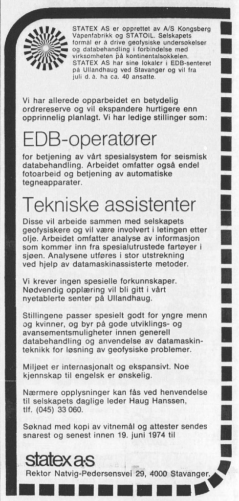 Based at Ullandhaug in Stavanger, Statex was intended to benefit from proximity to expertise concentrated in the nearby university college. The company grew quickly, had some 50 employees by the of 1974 and was constantly looking for more.[REMOVE]Fotnote: Johnsen, Arve, 1988, Utfordringen: 93.