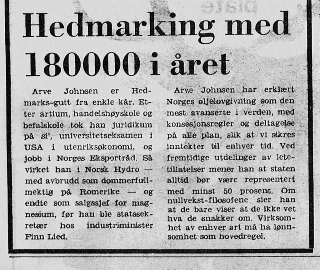The company had no earnings of its own to begin with, but drew on its share capital and appropriations from the Storting (parliament). So a restrictive line was taken both on salaries for the first employees and in other areas. Johnsen was not happy when Oslo tabloid VG wrote that he received NOK 180 000 per year – almost twice the amount other people in highly responsible positions at the company had been offered.[REMOVE]Fotnote: VG, 28 April 1973.