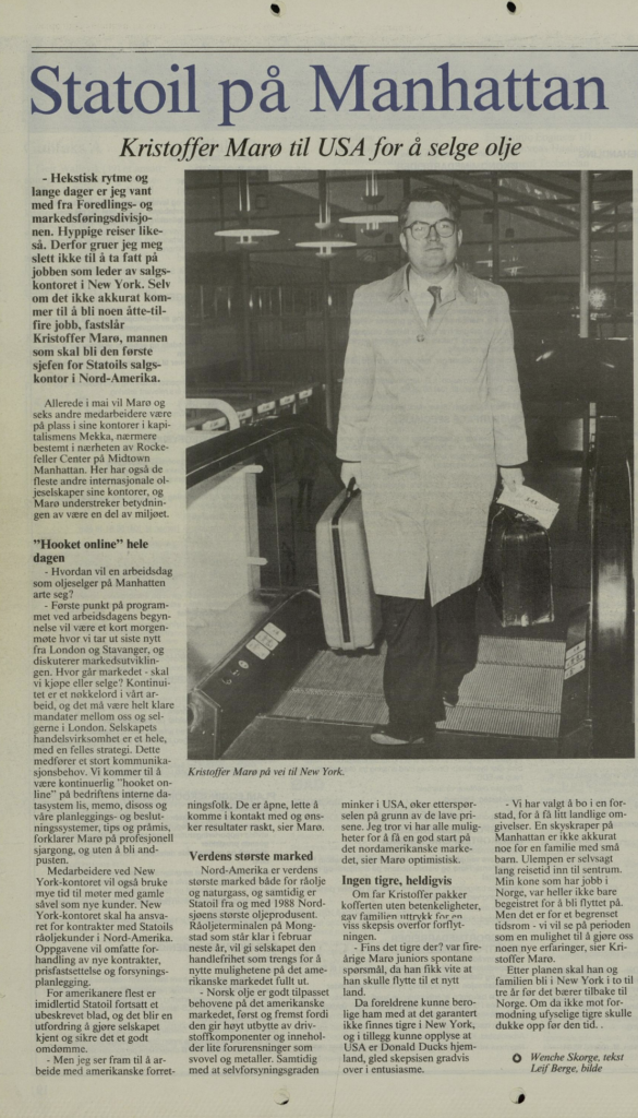 The company’s third sales office after Stavanger and London accordingly opened in Manhattan during June 1987. After Statoil’s Mongstad refinery became operational in 1988, the New York office could offer not only crude but also refined products and gas to the Americans.[REMOVE]Fotnote: Status, no 3, 9 March 1987, “Statoil på Manhattan”.