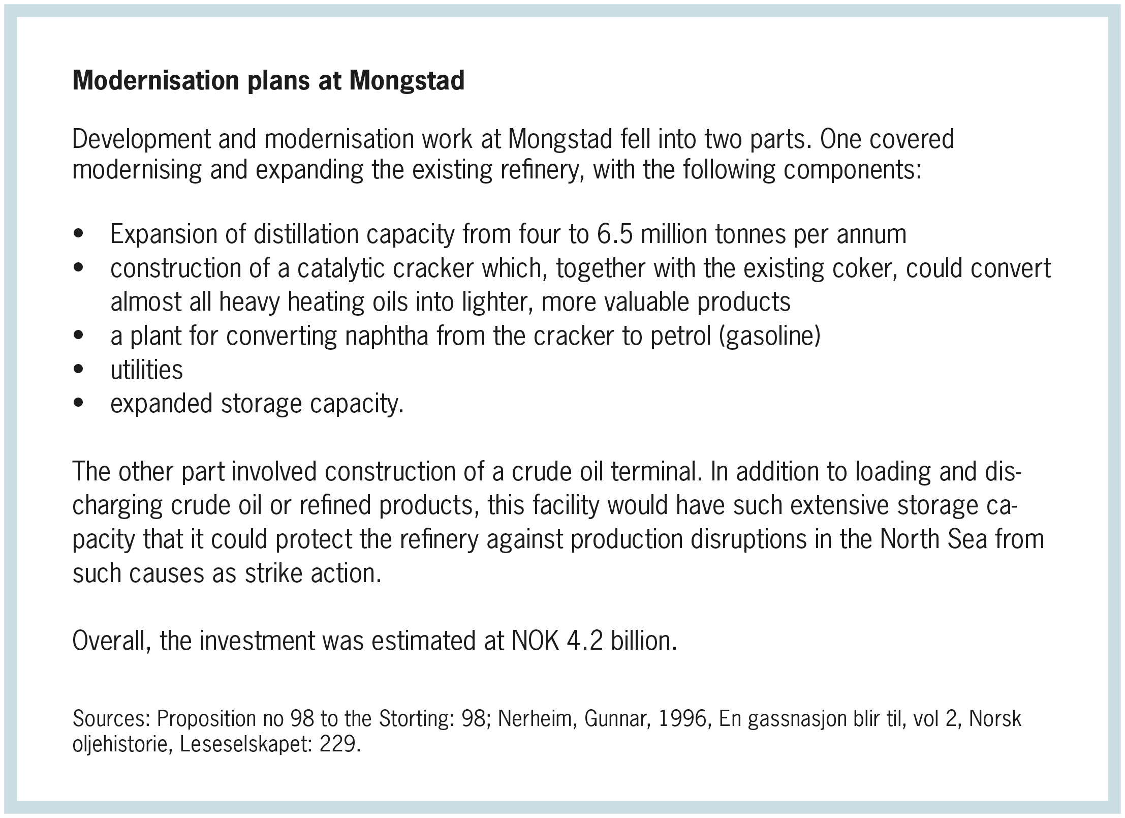 While Hydro thought a less extensive modernisation would be sufficient, Statoil maintained that this was inadequate and could ultimately result in the refinery being shut down – as many others in western Europe had been.[REMOVE]Fotnote: Proposition no 98, op.cit: 1.