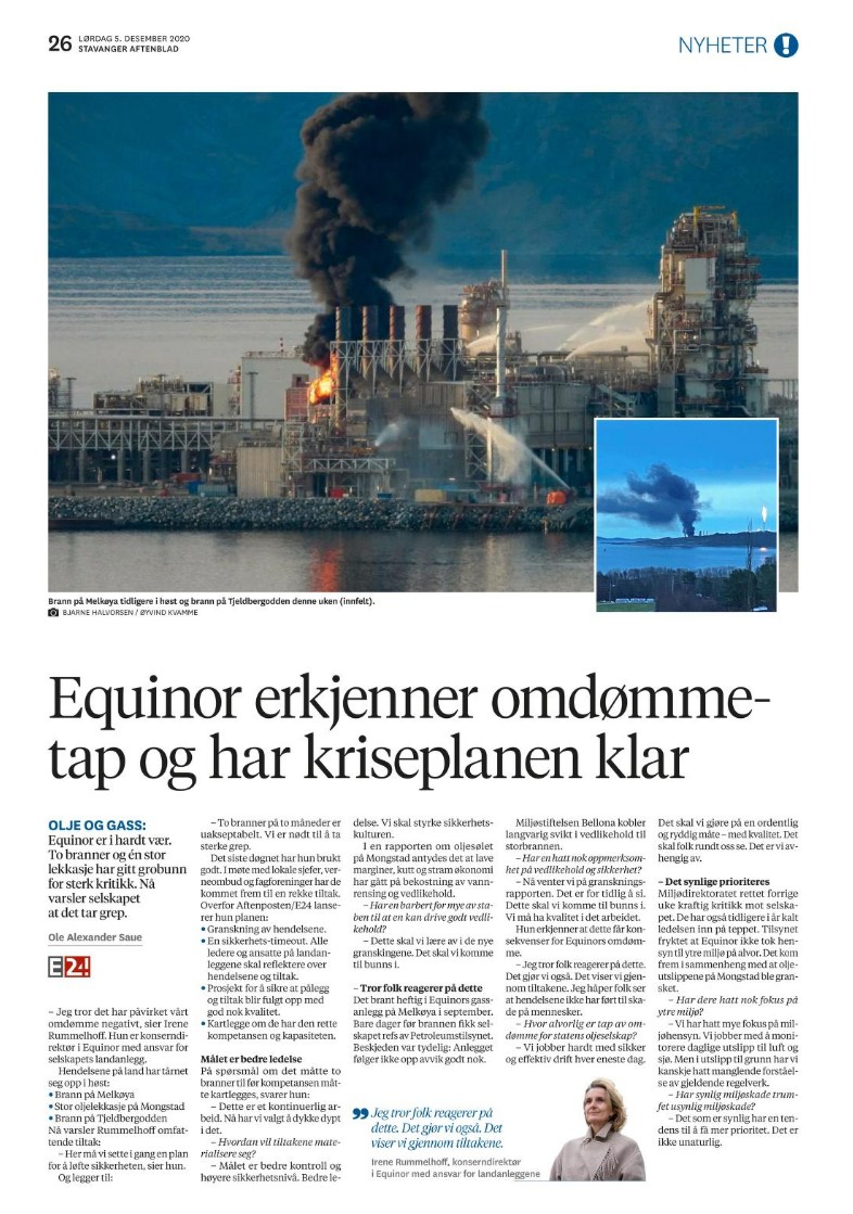 Dette gjaldt ikke minst Equinor. Ved å se på selskapets årsmeldinger kan en i grove trekk se hvordan selskapet reagerte på Ptils kritikk. I 2020 virket det diffust: «Læringspunkter fra disse granskningene [av brannen på Melkøya og Tjeldbergodden] kan ha betydning for hvilke områder vi ønsker å styrke innsatsen på.»[REMOVE]Fotnote: Equinors årsrapport 2020: