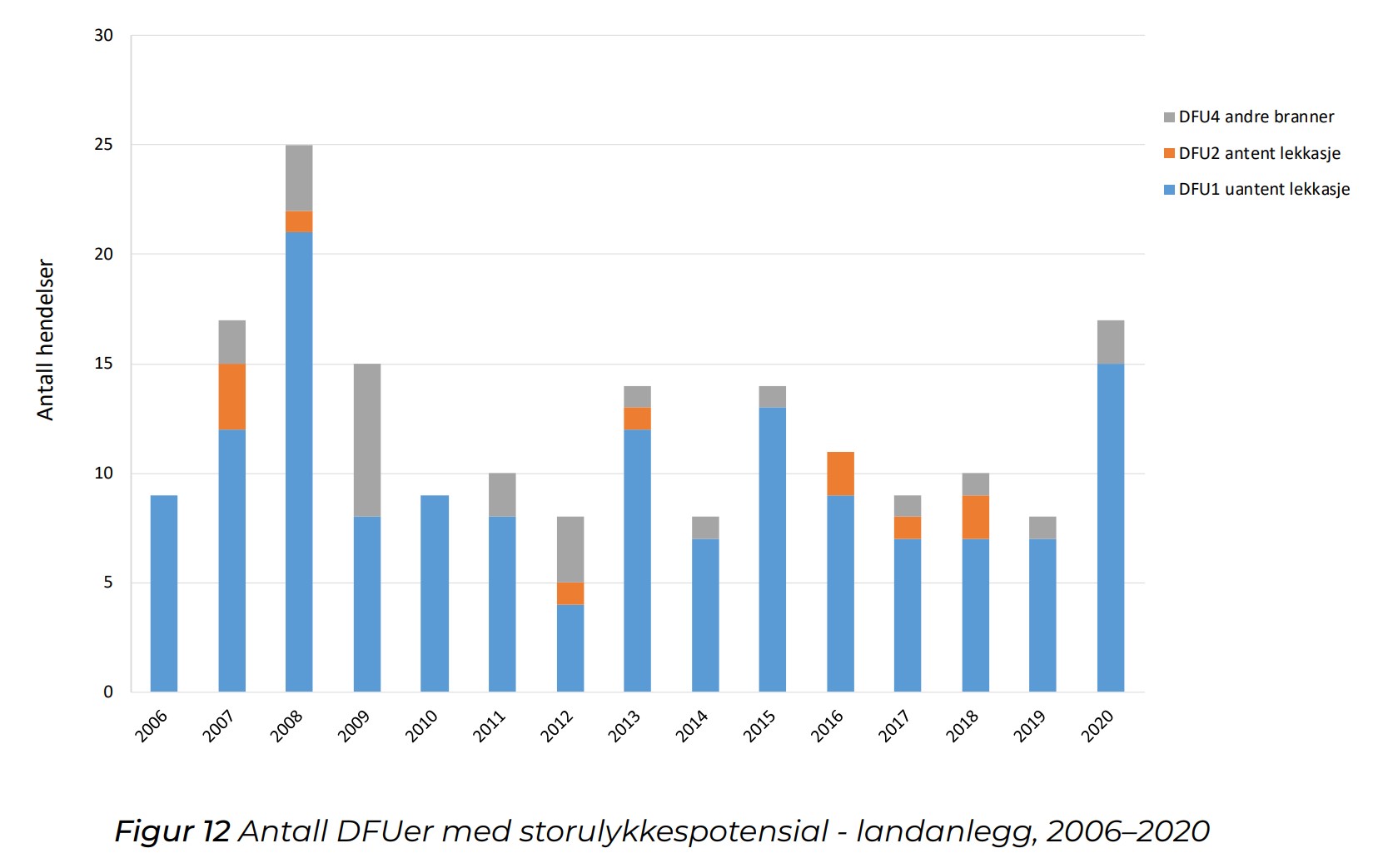 Etter at antall hendelser med storulykkepotensial på landanlegg hadde ligget på et stabilt nivå siden 2009, viste 2020 en markant økning. Ptil påpekte derfor at partene i større grad må prioritere arbeidet med å redusere antall hendelser og tilløp til hendelser på sine anlegg.[REMOVE]Fotnote: https://www.ptil.no/contentassets/e6c291f68aa0448aa1632c227f6e0834/arsrapport-2020.pdf