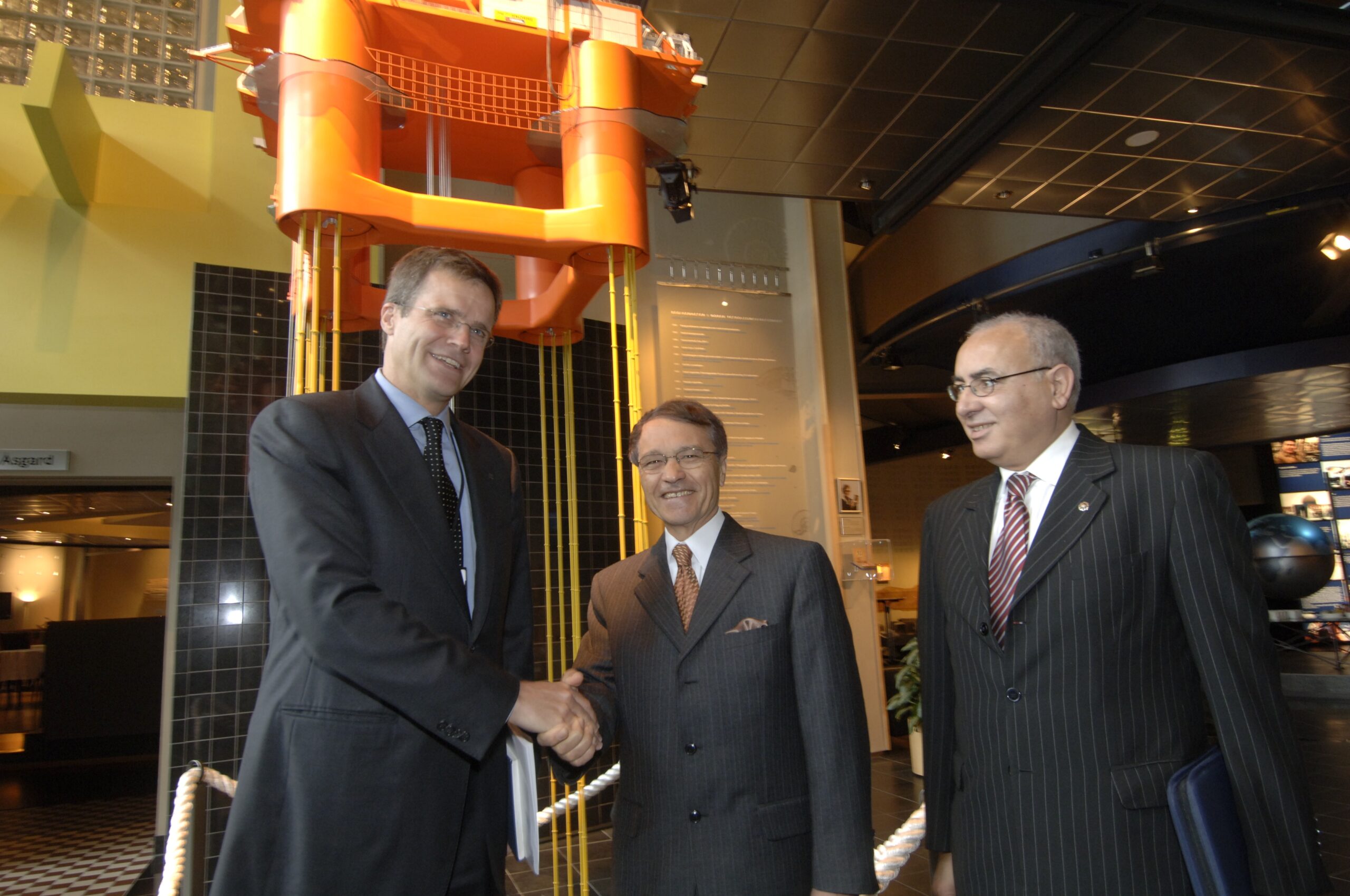 Helge Lund sammen med Algeries energiminister Chakib Khelil (midten) og adm. dir. i Sonatrach Mohamed Meziane, 2005. Foto: Øyvind Hagen/Equinor
