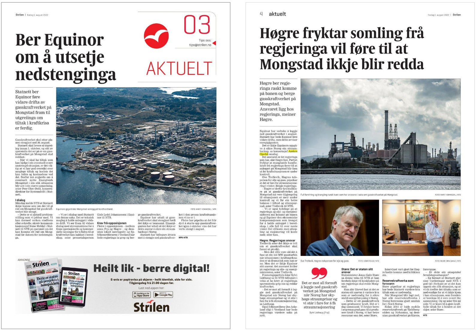Selv om Statnett vurderte det «opp mot 20 prosent sannsynlig» at det ble strømrasjonering til vinteren, svarte Equinor-sjef Anders Opedal at Equinor er et vanlig børsnotert selskap og at forsyningssituasjonen ikke er selskapets problem.[REMOVE]Fotnote: NRK, 02.08.2022, «Statnett ber Equinor utsetje nedstenginga av gasskraftverket på Mongstad». Dilemmaet for Equinor med staten som majoritetseier har vist seg også i denne situasjonen, slik det gjorde i forbindelse med «Månelandingsprosjektet». Equinor er fortsatt under press for å brukes som politisk instrument av staten, enten ledelsen i selskapet og øvrige aksjonærer liker det eller ikke.