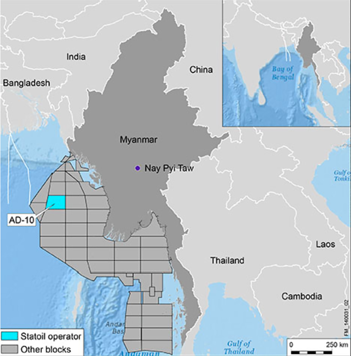I 2014 søkte Statoil om lisens i to blokker, men fikk kun én. Lisensen for blokken i Bengalbukten utenfor kysten av Myanmar ble tildelt Statoil sammen med ConocoPhillips med 50 prosent eierandel på hver. Statoil hadde rollen som operatør.