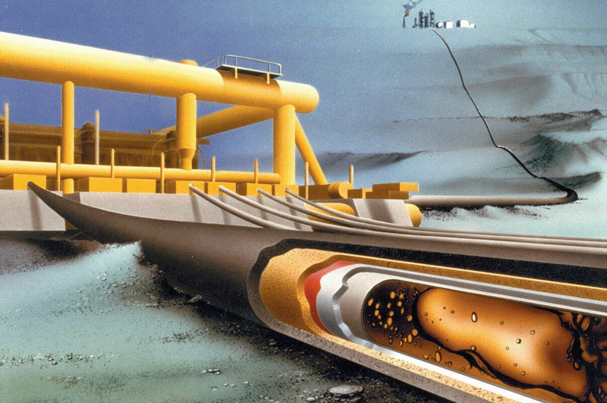 Blandingen føres så videre i rør langs havbunnen. Da blir den nedkjølt av det kalde vannet røret er omgitt av. På store dyp kan temperaturen i havet gå ned mot null. Det fører til at egenskapene til brønnstrømmen forandrer seg enda mer, og det skjer kjemiske reaksjoner i hele rørets lengde, som kan arte seg på mange måter.