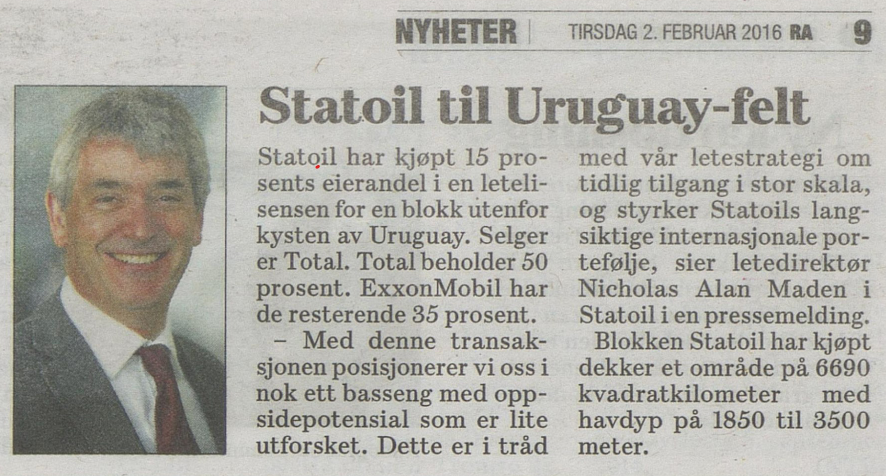 «Statoil til Uruguay-feltet». Faksimile: Rogalands Avis, tirsdag 2. februar 2016