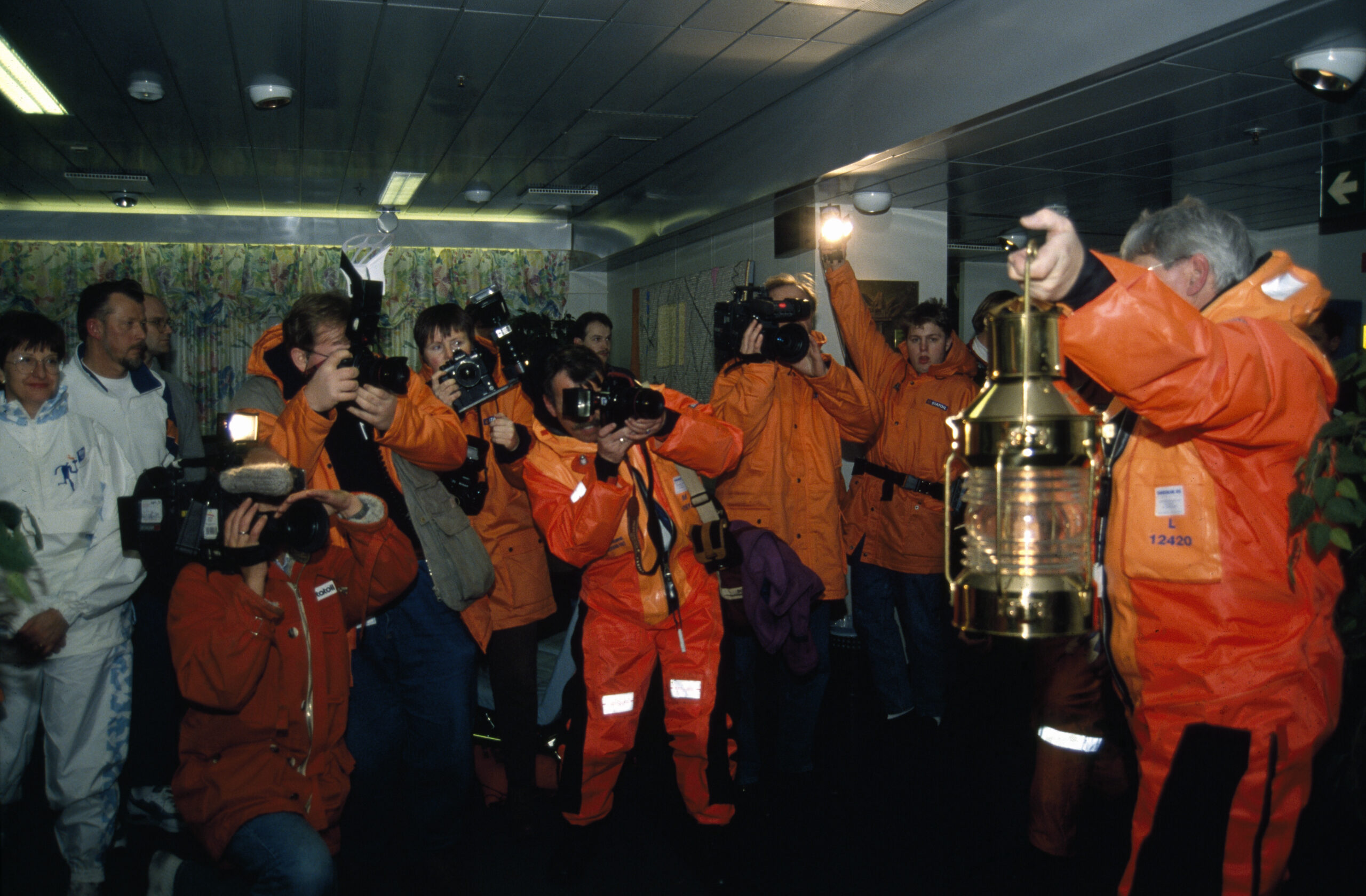 Vel om bord tente sjefen for Postverket i Hordaland, Haldis Myking, en miniutgave av en OL-fakkel med OL-ilden fra lykten. Hun løp så nedover trappene i ni etasjer på plattformen til spisesalen der fakkelseremonien fant sted.