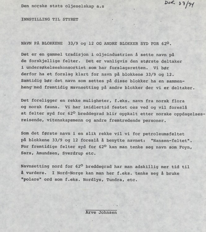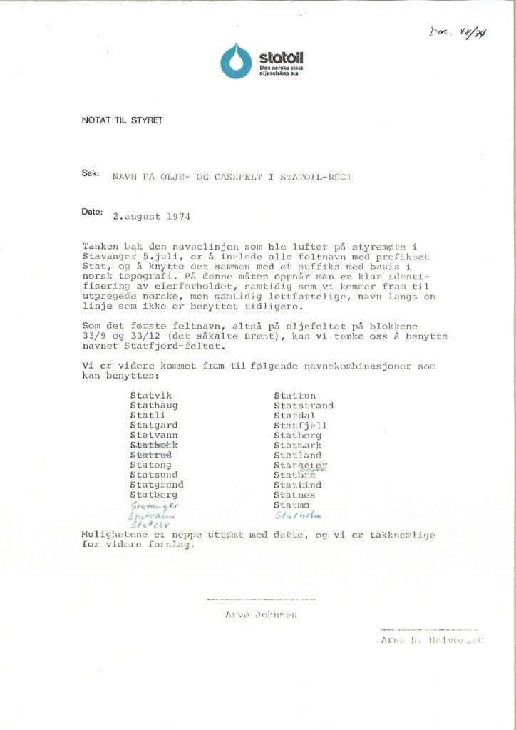I en sak til styret i mai 1974 foreslo Statoil-direktør Arve Johnsen at det skulle tas i bruk navn etter norske oppdagelsesreisende på Statoils felter. Brentfeltet skulle gis navnet «Nansen-feltet», og kommende felt kunne bære navn som Foyn, Sars, Amundsen, Sverdrup etc. Styret var imidlertid ikke fornøyd med dette forslaget, og ba om alternativer. På et styremøte i august kom forslaget om å bruke navn med «Stat» som prefiks og et suffiks med basis i norsk topografi, noe som ble bedre mottatt.[REMOVE]Fotnote: Notat til styret, dok. 48/742. august 1974.