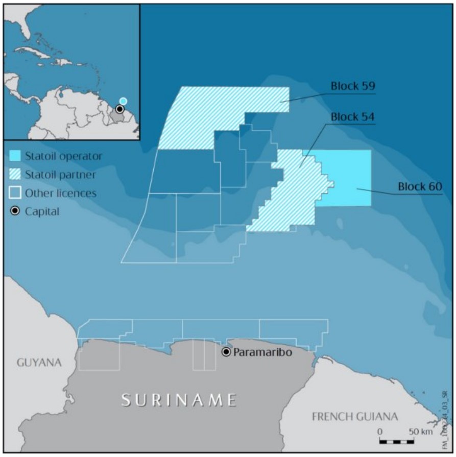 I 2011 ble oljeforekomstene på Surinams sokkel omtalt som massive av Oil Investing News.[REMOVE]Fotnote: Attention On Guyana and Suriname Following Tullow Oil Find in French Guiana | INN (investingnews.com) Statoil meldte sin interesse og kjøpte den første lisensen i området i 2013, i blokk 54. Selskapet fikk en eierandel på 50 prosent. Det opprinnelig irske oljeselskapet Tullow, som hadde den andre halvdelen, var operatør. I 2015 overlot Tullow 20 prosent av sin andel til det amerikanske oljeselskapet Noble.[REMOVE]Fotnote: Suriname | Tullow Oil plc (LSE: TLW) Vanndypet på blokken varierte fra 200 til 1300 meter.