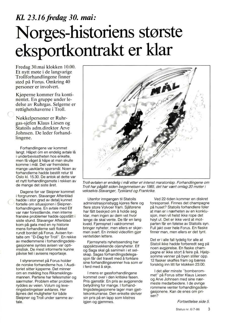 I grålysningen fredag 30. mai 1986 visste imidlertid ingen hvordan dagen kom til å forløpe – selv ikke Arve Johnsen.[REMOVE]Fotnote: Johnsen 1990, s. 264. Han begrunnet usikkerheten med at «[d]et var ikke alltid like lett å holde orden i rekkene […] og tidvis kunne vi være mer enn 30 personer til sammen i forhandlingslokalet.»[REMOVE]Fotnote: Johnsen 1990, s. 258. Denne formiddagen var det samlet ikke mindre enn rundt 40 personer fra begge parter i Statoils hovedkvarter på Forus.[REMOVE]Fotnote: Status nr. 6/7 1986, s. 3. «Norges-historiens største eksportkontrakt er klar». Se også Johnsen 1990, s. 264.