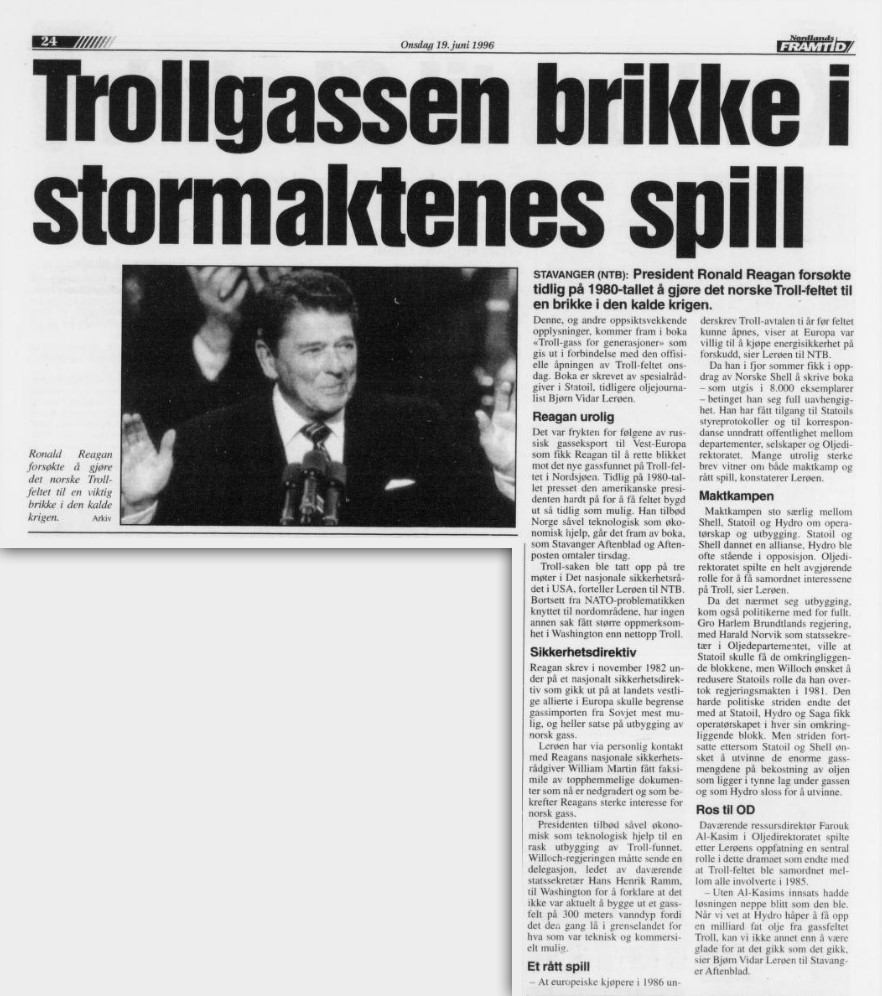 Som om ikke forholdet mellom USA og Sovjetunionen var kjølig nok fra før av, kom i 1981 en konservativ administrasjon til makten under president Ronald Reagan, der den anti-sovjetiske retorikken ble trappet opp. Krefter i administrasjonen var ivrige etter å forsere utbyggingen av norske gassreserver, fremfor alt Troll, for å svekke fienden i øst. Saken var viktig nok til å bli behandlet i det nasjonale sikkerhetsrådet (NSC) flere ganger.[REMOVE]Fotnote: Lerøen, Bjørn Vidar 2002. Dråper av svart gull. Statoil 1972-2002. Statoil, s. 194. Et eksempel er NSC-direktivet av 16. november 1982 der viktigheten av «accelerated development of alternative western energy resources, principally Norwegian gas reserves» ble trukket frem.[REMOVE]Fotnote: National Security Decision. Directive Number 66, datert 16. november 1982. Hentet fra faksimile i Lerøen, Bjørn Vidar 1996. Troll. Gass for generasjoner. Shell, s. 79.