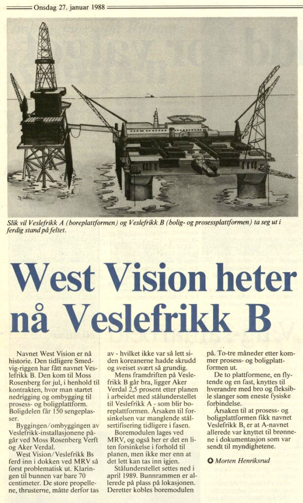 «West Vision heter nå Veslefrikk B». Faksimile: Status 1988 Nr. 2